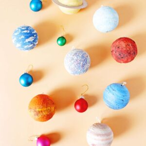5. Cut a long piece of fishing wire to the width of your hoop. String ornaments of varying sizes on the wire.